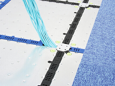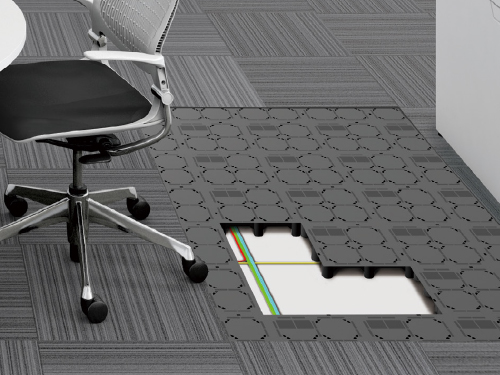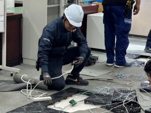 配線ケーブルはOAフロアの床下に収納し、レイアウト図面に沿って整理します。必要な位置からケーブルを引き出せるよう、取り出し口の位置や経路を調整しながら配線していきます。