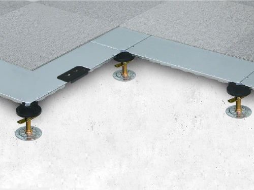支持脚タイプのOAフロアは、脚部で床材を支える構造のため高さ調整が可能で、床面を水平に仕上げられる点が大きな特徴です。パネルは金属製のものが多く、歩行時の安定性や耐久性に優れています。費用は置敷樹脂タイプに比べると高くなりますが、そのぶん仕上がり品質・メンテナンス性・配線の自由度が高いシステムです。レイアウト変更が多い企業や、長期利用を前提としたオフィスには特に適したOAフロア工法といえます。